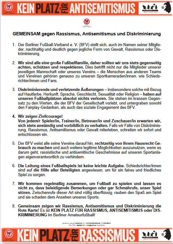Unsere Partner von Berlin gegen Nazis haben gemeinsam mit dem BFV eine Erklärung gegen Rassismus, Antisemitismus und Diskriminierung verfasst. Eigentlich sollte das darin beschriebene für jeden von uns eine Selbstverständlichkeit und nichts Neues sein. Wir müssen uns aber tagtäglich im Klaren darüber sein, dass wir in unserem Kiez in einer relativ abgeschotteten Blase leben, was diese Themen angeht. Aber auch hier begegnen wir institutionellem und alltäglichem Rassismus. Vorfälle, wie der in Hanau oder der durch Polizeigewalt gestorbene George Floyd erinnernn uns daran, wie wichtig es ist für diese Werte einzustehen.
