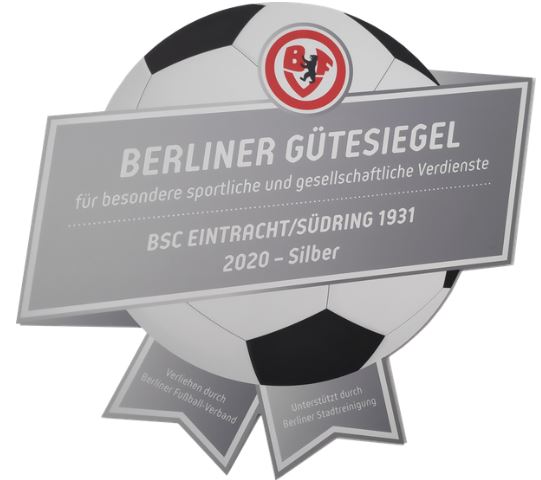 Unser BSC Eintracht/Südring hat das BERLINER GÜTESIEGEL in der zweithöchsten Stufe "SILBER" erhalten. Dafür sind mindestens 75 von maximal 100 Punkten erforderlich. Nur, wer dreimal hintereinander die Kriteiren für Silber erfüllt bekommt dann auch das Goldene Gütesiegel.