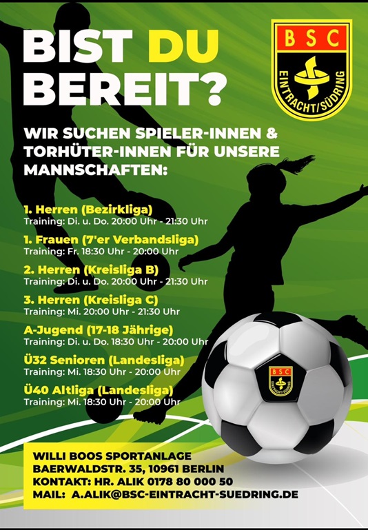 Mail-Anfragen für die Damen-Herren-Abteilung aller Art an fussball@bsc-eintracht-suedring.de.