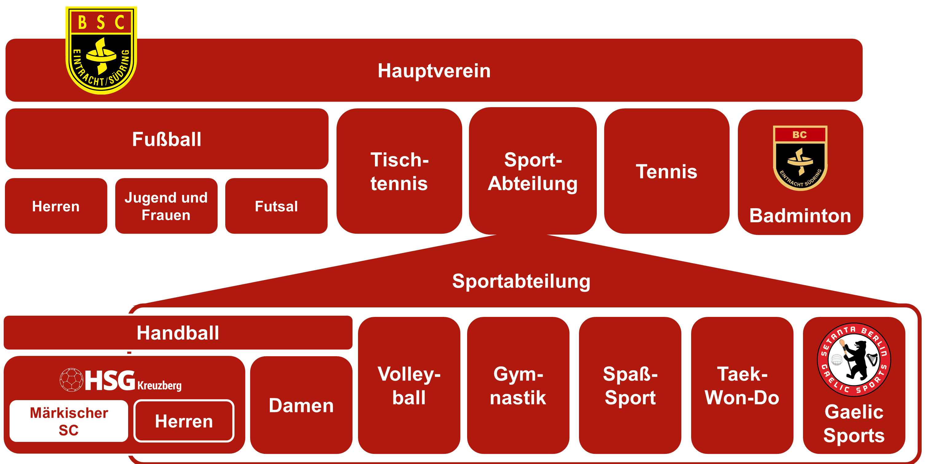 Der Hauptverein bildet die organisatorische Klammer um diese Abteilungen, der Hauptvorstand vertritt den Verein nach außen und koordiniert ihn nach innen.